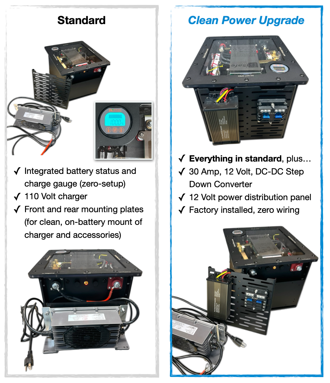 The Clean Power Upgrade delivers a factory-installed 12V DC-DC step down converter with power distribution panel. Beautifully installed on our custom accessory panel.